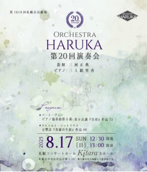オーケストラHARUKA 第20回演奏会 2025/8/17(日)札幌コンサートホールKitara 大ホール 指揮:三河 正典 プログラムベートーヴェン:ピアノ協奏曲第5番 変ホ長調「皇帝」作品73 [ソリストアンコール]R. シュトラウス:「4つの情緒ある風景」よりIntermezzo |