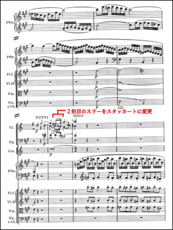 最も素晴らしかったのは、第1楽章の展開部で新しく登場する主題の扱い。譜例2のように最初に木管に出てくる。赤線の箇所は楽譜ではスラーだが、反田はここをスタッカートで吹かせた。2回目も同じくスタッカート。ここまでは鼻歌のような気軽さがある。だが、3回目に音型が下降型になると、涙が零れおちるようにレガートで奏でるのだ。こんなに心理的に聴こえるものかと思った。
