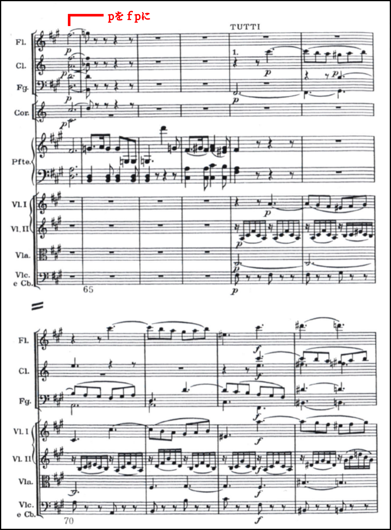最も素晴らしかったのは、第1楽章の展開部で新しく登場する主題の扱い。譜例2のように最初に木管に出てくる。赤線の箇所は楽譜ではスラーだが、反田はここをスタッカートで吹かせた。2回目も同じくスタッカート。ここまでは鼻歌のような気軽さがある。だが、3回目に音型が下降型になると、涙が零れおちるようにレガートで奏でるのだ。こんなに心理的に聴こえるものかと思った。