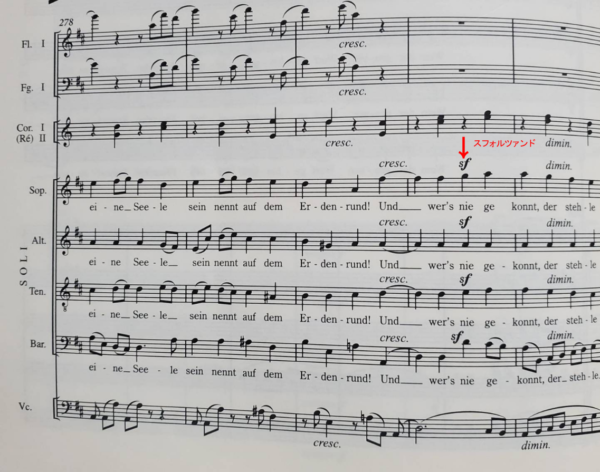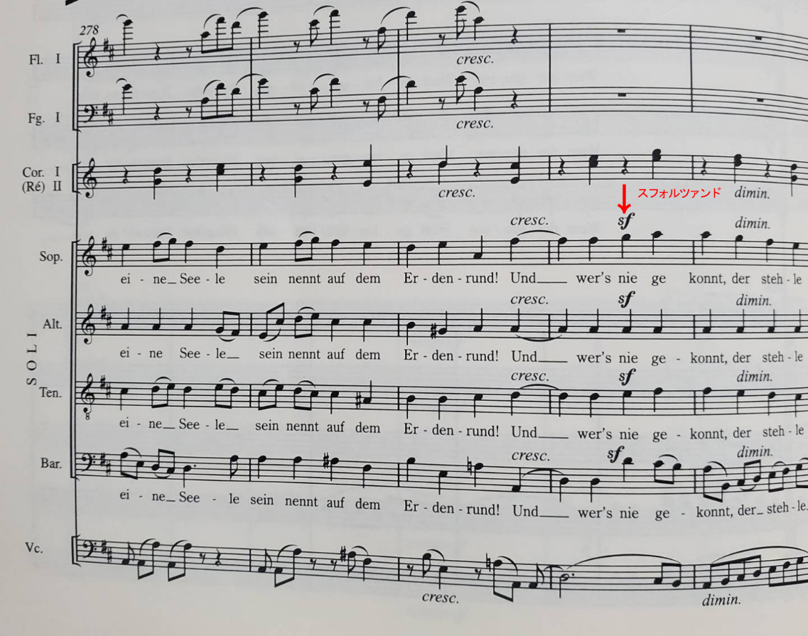 終楽章の声楽パートでスフォルツァンドが強調されたのは、記憶が正しければ、おそらく一箇所のみ。Allegro assai(237小節~)の、”Und wer’s nie gekonnt,der stehle”。「それができない者はそっと出て行くがいい」という歌詞の箇所。前段では、「真実の友を得る」、「優しい妻を得る」ことが讃えられている。それが“できない”を強調する否定辞の”nie”にベートーヴェンはスフォルツァンドを書いている(譜例:1)。この否定辞のスフォルツァンドはたしかに強調された。だが、それ以上に印象深かったのは、その後のディミヌエンドだった。ここでソリストの4人は、優しく憐れむようにディミヌエンドしたのだ。まるで、真の友や妻を得られない者へと眼差しを注いでいるかのようだった。